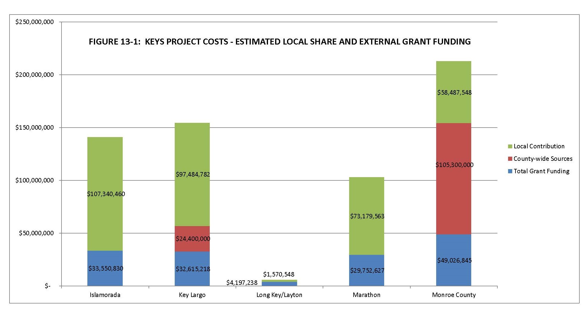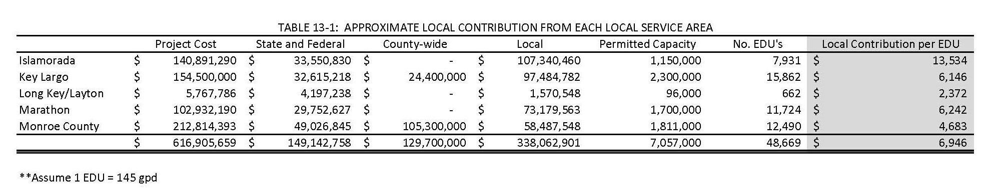 Here’s another interesting factoid from Table 13-1. Key Largo taxpayers contribute about the same as Marathon taxpayers on a per EDU basis. It is important to keep in mind that as an incorporated area, Marathon receives a portion of the infrastructure sales tax directly. They do not need to depend on the county. So in Marathon’s case, any sales tax used for the sewer project offsets the amount required from the ratepayers. That means that Marathon ratepayers potentially have a lower contribution on a per EDU basis than Key Largo ratepayers do.