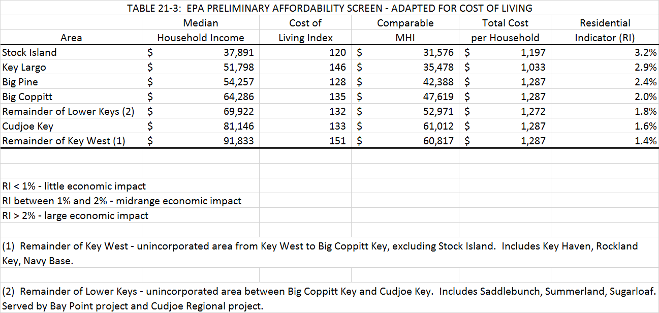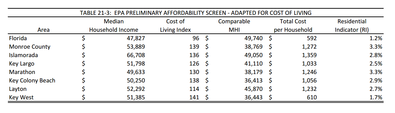 At the bottom of the table are a few notes. Most important is what the RI means. An RI of less than 1% generally means a low economic impact. An RI between 1% and 2% indicates a moderate economic impact. And an RI over 2% means a high economic impact. Stock Island has the highest RI at 3.2%. Monroe County did try to address this. Stock Island residents pay the lowest assessment of all the areas examined, $2,700 per EDU. Even so, the Median Household Income (MHI) there is very low, which makes the RI quite high. You’ll notice that Key Largo has the second highest RI at 2.9%. We all know the story there. The only other area with a high economic impact would be Big Pine with an RI of 2.4%. The others, with their high MHI and generous treatment by Monroe County are within the moderate economic impact range.