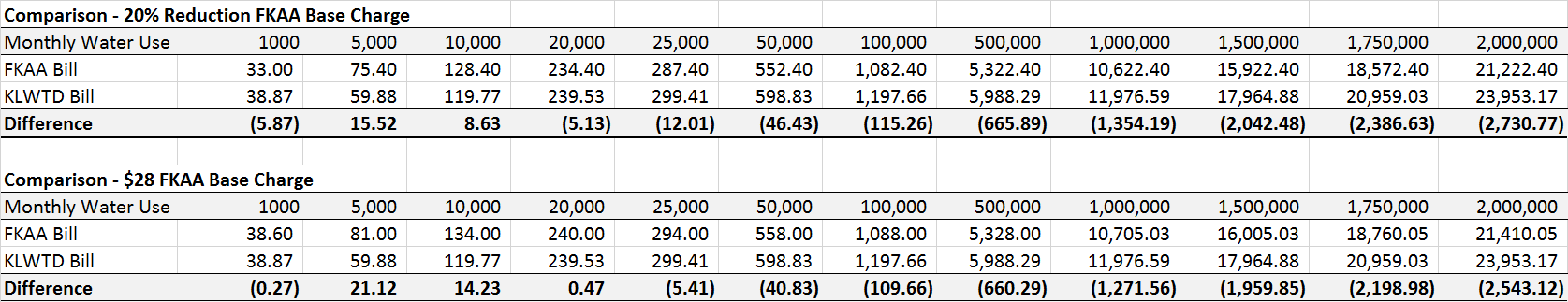 This is very, very, very interesting. Base charge reduced by 20%, eh? That certainly shoots another hole in the already shaky argument that Key Largo supposedly pays lower rates so it’s perfectly okay go ahead and rip us off on the capital side. Here’s how the reduction would change the rate picture.