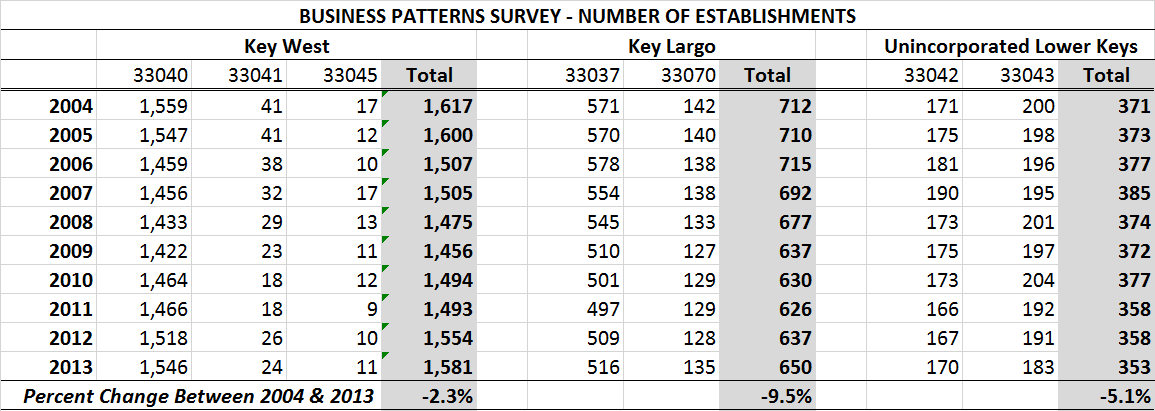 Notice that the number of establishments in Key Largo is 9.5% below what it was in 2004. In the Key West area, it’s only 2.3% below what it was. So that area is well on its way to recovery. The unincorporated Lower Keys have 5.1% fewer establishments than they did in 2004. Not as healthy as Key West, whose sewer project is long behind them. But not struggling to the same extent as Key Largo either.